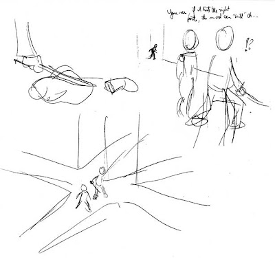 Sometimes we get really stuck on laying out a sequence – I know I was for this final scene which was to take up 10 whole pages. I had no idea where to start. What got me out of the rut was to just sketch out, very basically, the action as I saw it in my head, without giving a thought to layout or camera angles. Basically what I'd see if I were on the set of a movie as opposed to watching it edited on a screen. This gave me something tangible to work with. First, I could see immediately what was redundant and what needed an extra step for clarification, what flowed and what didn't, what demanded an extreme angle or a big space on the page. Then I could dump those little scribbles on my Photoshop pages and work the layout from there.